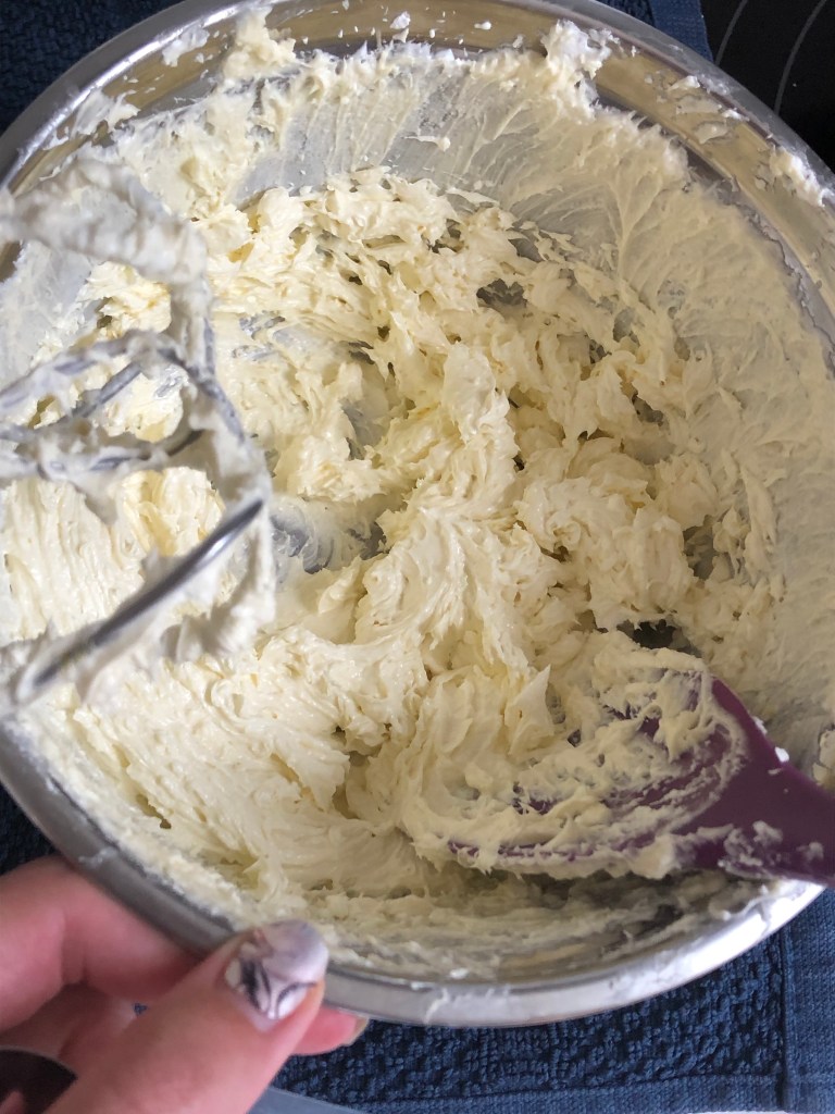 - Cream together the butter and sugar with an electric mixer on medium high until pale and fluffy (2-3 minutes).